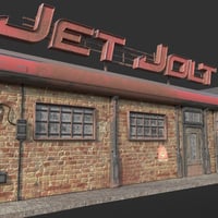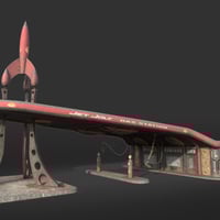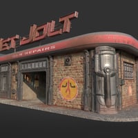 Here is a complete set of two gas stations (one is worn, the other is destroyed) and their accessories. Tires, boxes, chains, sets of bricks on the ground, garage furniture and also a Bracket but also station signs and fuel price range.