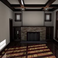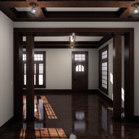 Collective3d Movie Sets Modern Home Interior represents two rooms of a refurbished 1916 California Bungalow. This interior features walnut floors and trim, including a beamed ceiling, as well as a stone fireplace, built-in bookshelves, and authentic American Craftsman style passage and entry doors. The unique windows allow an abundance of light to enter this fully enclosed interior set. Each element can be removed or hidden individually to allow easier access for cameras.