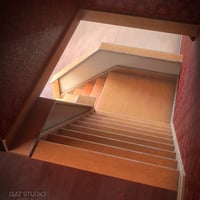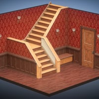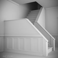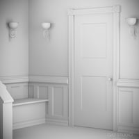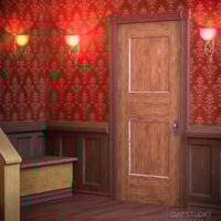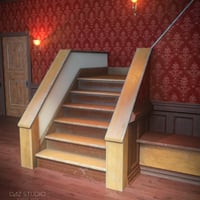 The set includes the two walls, floor, and ceiling meshes along with a partial upstairs corridor, a stairwell with bench seat, and a lighting sconce. The Iray version features a lighting preset simulating the kelvin color and luminosity of early electric incandescent lights. Each mesh is fully unwrapped and textured with maps up to 4k in resolution.