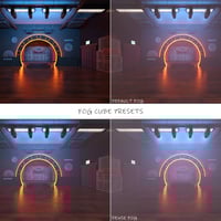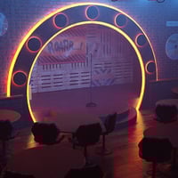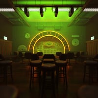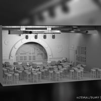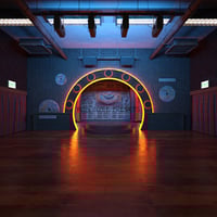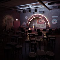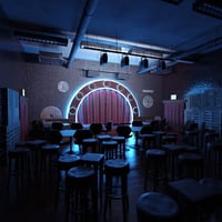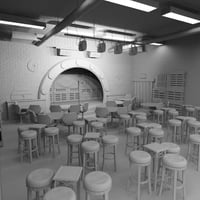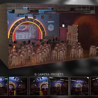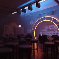 A comedy club, complete with seating, tables and stools. A selection of cameras, a fog cube and lighting colours are included for extra versatility. Full rigging where applicable.