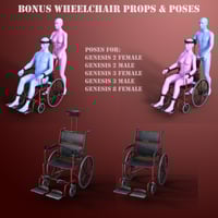 There's a fully rigged wheelchair for transporting your "clients", both with and without Conta restraints. Sitting and pushing poses are included for Genesis 2 Male and Female, Genesis 3 Male and Female, and Genesis 8 Female.