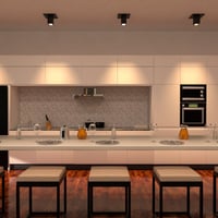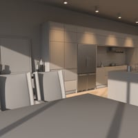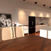 Featuring a sleek kitchen with built-in cabinetry, a long island with bar stools, and a spacious dining area with a wooden table and upholstered chairs, this set is perfect for rendering contemporary home scenes.