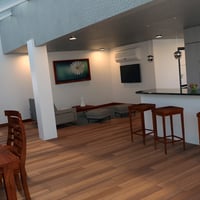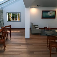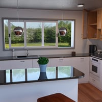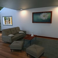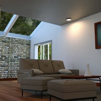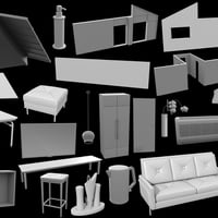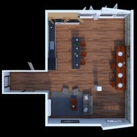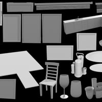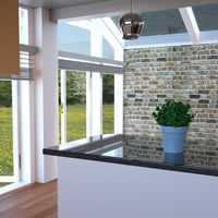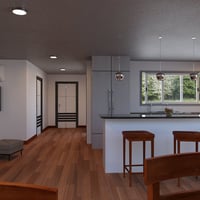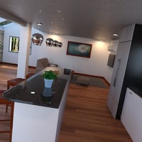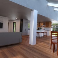 This a 3d model scene of a Kitchen that features a side view of trees and plants. It also includes a dining hall as well as a mini living room connected into rooms. It has plenty of objects that fits the scenery well.