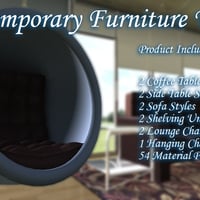 Add a modern touch to your renders with this pack of 11 contemporary furniture components. This pack includes 2 Styles of Coffee Tables, 2 Styles of Side Tables, 2 Sofa Styles, 2 Styles of Shelving Units, 2 Lounge Chair Styles and a Hanging Bubble Chair. All pieces have material presets included. 54 Material Presets in all!