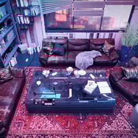 A retro cyberpunk living room in a condo is a perfect place to render your character with a cinematic story feeling.
