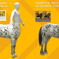DA Transfer existing Body Mats to other dForce SELECTION: Transfer textures from the Horse body surfaces to other dForce Hair applied to Centaur 9. (Target Surface: Coat, Hoof, and default only.)