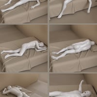 Full body poses representing our everyday activities at home: sleeping, wake up, bathroom time, eating, & resting in living room with tablet or watching TV.