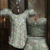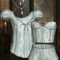 Delicate lace, braid and bows are combined to create Dainties for Boudoir Bliss, for the 3D lingerie clothing set for Genesis Female. Choose from creamy ivory or silky floral, and add the matching jewelry for that final dainty touch.