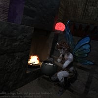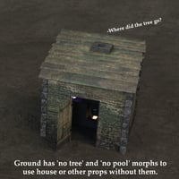 Dark Faerie Hollow is an exterior (un)natural environment set with a ground, tree, faerie-house, pool (for scrying or dancing), pond+stream, and faerie-light. Inside the house are a faerie-bed and a fireplace with a cooking pot. The faerie light comes with multiple color options but can be changed to any color in the surfaces tab. Morphs for the ground let you use the environment without the tree and/or scrying pool. The light has 2 different 'stands' for varying lighting (see promos).