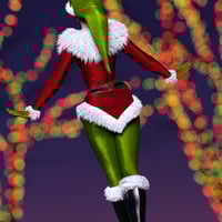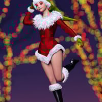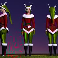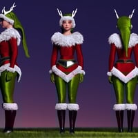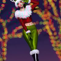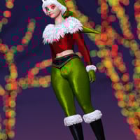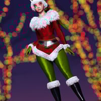 A fun Christmas themed outfit, featuring hat, gloves, leggings, belt, boots, tunic, skirt and fur.