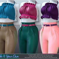 It includes 6 pieces: top, pants, belt, bangles left and right, and shoes. Along with 5 highly-detailed full presets, there are lots of options to customize each piece so you can style them to your scenes.