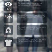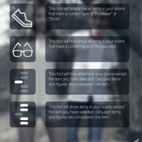 This product is a custom toolbar we use ourselves that adds several quick-access buttons to your Daz Studio 4 interface. These buttons can be used to quickly hide and show various content types in your scene to speed up the interface. It also includes buttons to set the mesh resolution of all the items in the scene to their lowest or highest subdivision setting.