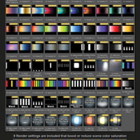 There are 57 materials that provide a wide variety of effects that can be used in any genre, as they represent both man-made and natural light situations including underwater. The Spectrum 18 preset can be used to create 3D stereoscopic images for use with Chromadepth glasses. Several utilities are included to assist you with changing brightness, hiding surfaces, luminance shape-masking, and making surfaces both hidden and emissive. There are 10 render settings, one creates a midnight light, the rest adjust saturation from black and white to double the default setting.