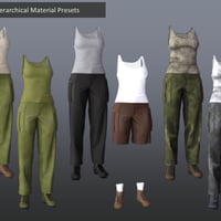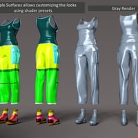 The outfit includes some hierarchical material presets for changing the look of the outfit. Also includes additional material and shader presets for changing selected surfaces.