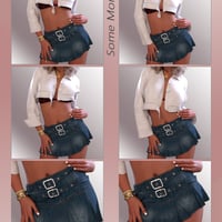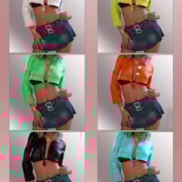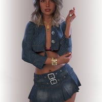 This chic outfit includes a short jacket, a trendy bra, a classic denim skirt, high heels, a statement necklace, and a delicate bracelet.