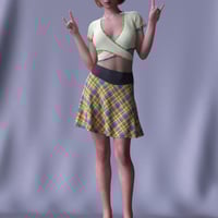 This Outfit consists of a cute wrap-around top in soft t-shirting with plaid details, accompanied by a pretty plaid and denim skirt, rounded off with a pair of mid-hight denim court shoes.