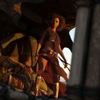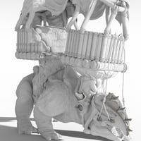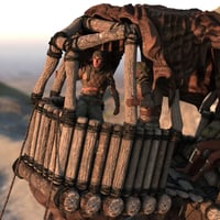 Designed around the concept of dual-yokes that could carry a variety of platforms atop the thickly-muscled creature, this kit features 2 wooden platforms adjoined by a rope and plank bridge, a leathery, patchwork canopy (with dForce cloth simulation!), and a pair of rope reins attached at the creature's armored headpiece. Rounding out the elements is a rigged rope ladder that attaches to the rear platform.