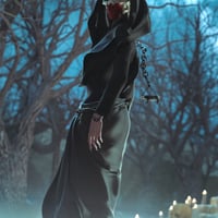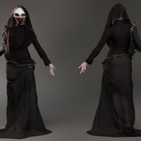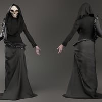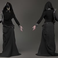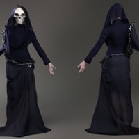 dForce BW Deathly Drape Outfit for Genesis 9, 8.1, and 8 Females is a Grim Reaper type outfit. It comes with a top, dress, mask and chain to complete the full look for any of your spooky or horror scenes.