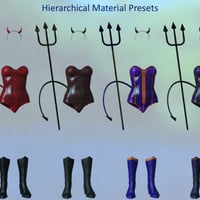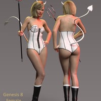 This outfit is for Genesis 9 and the Genesis 8 Female and includes dForce Suit, dForce undone suit, Boots, Posable Devil Tail, Horn Headband, and Pitchfork, along with a selection of material, shader, and dForce presets for use in DAZ Studio using Iray with dForce. The Genesis 9 version is optimized to work with the Genesis 9 Base Feminine shape.