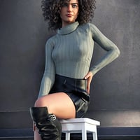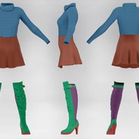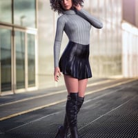 This set contains an elegant fiber sweater, a short leather skirt with a unique design and a pair of elegant leather and fabric knee high boots that complement a perfect outfit.