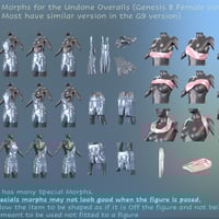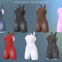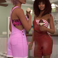 This set consists of Bib Overall Shorts and Tube Top for the Genesis 9 and Genesis 8 Female figure and a selection of material, shader, and dForce presets. The Genesis 9 version is optimized to work with the Genesis 9 Base Feminine shape. The Bib Overalls come with a default version and an Undone version where the straps are not connected to the bid.