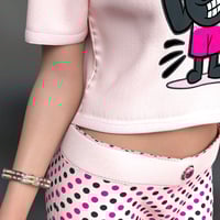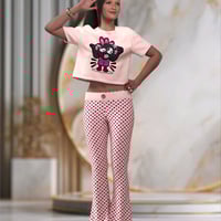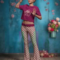 This chic and playful outfit is perfect for both casual outings and special occasions. The flared pants boast a flattering silhouette that elongates the legs and adds a touch of retro flair to your look. Paired with an adorable crop top featuring cute prints, you'll exude effortless style with a hint of whimsy. Complete your ensemble with a stylish bangle for the perfect finishing touch.