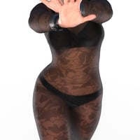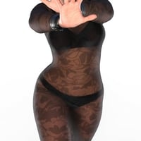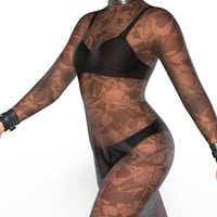 Its body-hugging cut accentuates feminine curves, while the black mesh fabric is enhanced with velvet floral patterns, adding a touch of refinement and sensuality.