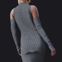 Complementing the dress are matching fingerless gloves made from the same cozy materials.