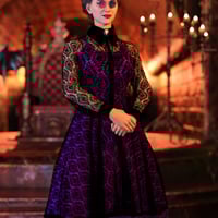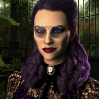 The rich purple satin dress is perfectly complemented by a delicate black lace overdress, exuding both mystery and sophistication. A meticulously crafted cameo brooch adds a touch of vintage opulence, while the pinch nez glasses provide an air of intellectual intrigue. Whether you’re navigating 3D steampunk adventures or delving into dark vampire hunts, this outfit ensures you do so in unforgettable style.