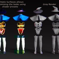 The outfit includes some hierarchical material and material presets for changing the outfit's look. It also includes additional shader presets for changing selected surfaces on the outfit.