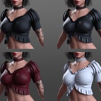 dForce DC Ruffled Top Set for Genesis 9 features a dForce top, dForce pants, Ankle Boots, and a collar. This outfit set includes four pieces, and, in addition to the materials presets, the clothing colors can also be customized. The outfit is made for dForce but works great as conforming as well.