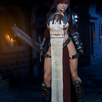 The outfit includes a dress with a hood, detailed boots, gloves, panties, earrings, and a two-handed sword, blending sensuality and strength in a unique design.