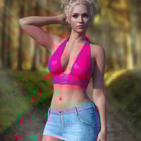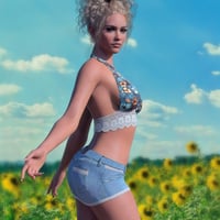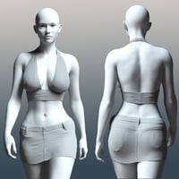 A denim mini skirt with distressed jean texture along with a frayed hem option and a white lace trim option. Also included is a halter top with patterned textures and solids with waist lace options as well. Both the skirt and the halter top are partially dForce enabled.