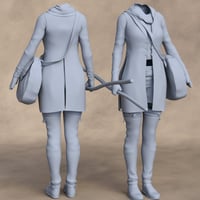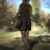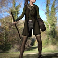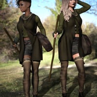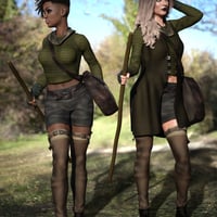 Beautiful Post Apocalyptic oriented set for Genesis 8 Female that has a shirt, jacket, shorts, leggins, shoes, gloves, scarf, carrying bag, belt and a walking stick.