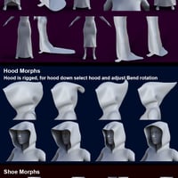 Robe - the hood is rigged and can be used up or down. The skirt is fully rigged, it only partially follows the figure, finish the look with manually positioned skirt bones or cloth simulation. The Eternal Handmaiden pose package also includes matching robe poses. The robe is fully loaded with adjustment morphs, styling morphs as well as a giant assortment of DAZ named shapes and base shape support.