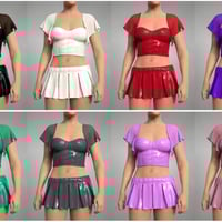 This versatile ensemble includes a corset-style top with removable short sleeves, a pleated mini skirt with length adjustment morphs, and a coordinating panty.