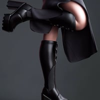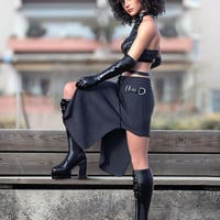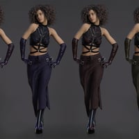 This set contains a top, long skirt, gloves, and high boots finished in fabric, leather, and metal. There are a total of 4 pieces in the set.