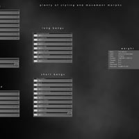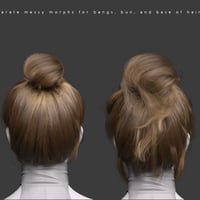 Also included are 7 morphs for the base, 2 morphs for the bun, 7 morphs for the long bangs, 9 morphs for the short bangs, and 6 morphs for the cap. There are 30 hair material presets, 14 tip materials for the long bangs, and 14 tip materials for the bun!