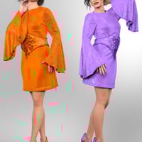 It features a flowing dress paired with a corset-style belt designed to create a dramatic silhouette.