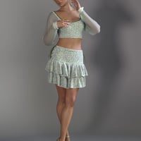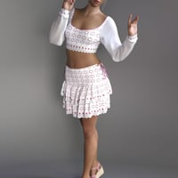 This outfit consists of a ruffled skirt, a crop top with long sleeves, wedge sandals, and a panty.
