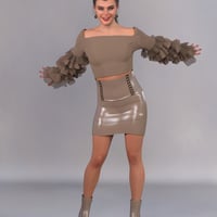 It consists of a crop top with frilly sleeves, a short mini skirt, trendy shoes, and matching earrings.