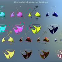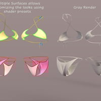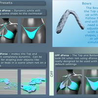 The swimwear includes hierarchical material presets for changing the look of the outfit. Additional material and shader presets greatly expand the ability to customize the look. The Material presets will work with either the Top, Bottom, or Bows.