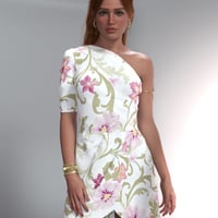 Perfect for summer poolside parties or an elegant night on the town. Larissa Outfit consists of a beautiful one-shoulder dForce dress with matching panties and mid-heeled zipper-back sandals. An arm cuff, hoop earrings, and bracelets complete Larissa Outfit. Included are pastel material options for the dress, plus a glamorous black selection. Material options for the panties and sandals complement the dress. The jewelry comes in gold with colored petals on the arm cuff. The dress was designed to be used with dForce, but can be used as conforming with gentle poses.