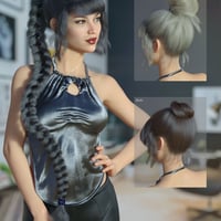 dForce Lea Hair 2 is a set of new tails and morphs compatible with dForce Lea Hair. The original dForce Lea Hair with ponytail is not required. This set includes a long plait, a bun, a top knot, and extra fringe(bangs) style morphs. ERC pose control dials help fit your figure poses beyond the 48 sample hair poses provided. The dForce hair is grown on a skull cap which is fitted for Genesis 3 & 8 Female(s) (.DUF) and auto-follows most character head shapes.