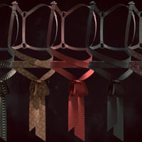 Silk ribbons, carefully tied, add a touch of delicacy and sensuality. They wind around the body, forming knots and loops that beautifully contrast with the strictness of the leather. The ribbons create a sense of movement and fluidity, softening the harnesses' strict structure.