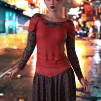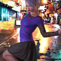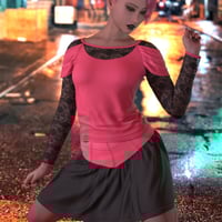 The dForce LV Emo Style Outfit for Genesis 9 consists of a lace and cotton t-shirt knit long sleeve top with cap-sleeve detailing, in trendy dark colours and black; as well as a denim weave and polyester skirt with V front waistband in dark colours and black, with the option of plain or polka-dot skirt bottom.