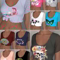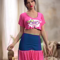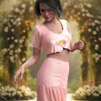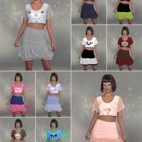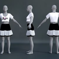 Turn heads with the Lya Outfit for Genesis 9. The outfit consists of a stylish printed cropped top paired with a denim and lace fabric frilly skirt!