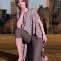 A modern HiLo cut blouse in trendy earth-toned fabrics to mix and match with Pedal pushers/Capri pants in a solid denim weave fabric and rounded out by comfortable, yet fashionable slip-on sandals with gem detailing.
