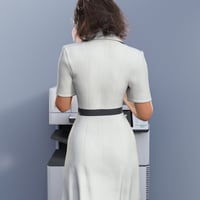 It features a tailored design that accentuates the feminine silhouette, with a modestly low neckline that adds a subtle touch of allure. The short sleeves and above-the-knee length give it a professional yet fashionable appeal.