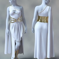 The dress features a draped design with a deep neckline, revealing just the right amount of skin to add a touch of allure to your character. The corset is intricately crafted with a lace-up back and gold accents that draw attention to the figure's curves. The sandals feature delicate straps that wrap around the ankles, adding a touch of elegance to the entire look.